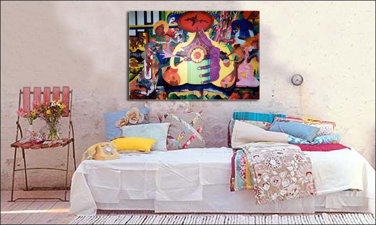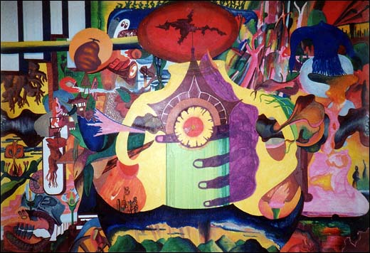 Ein frühes Werk des Künstlers mit kleinen Details. Farbenfroh, wirre Muster und kleine Zeichnungen. Im Mittelpunkt die Spritze, umgriffen mit einer Hand zeigt sie nach oben zu einem aufgesprungenen Ei. Alles wirkt in sich verwachsen und bildet ein Ganzes. a.b.