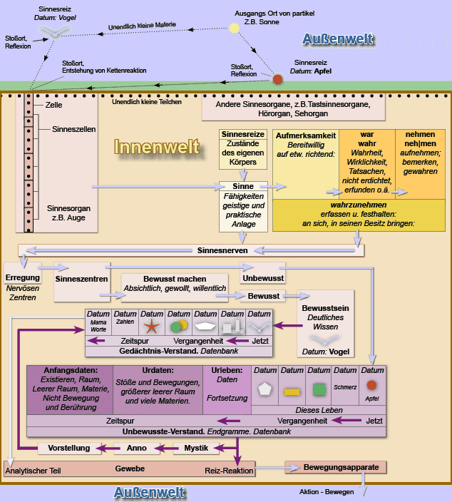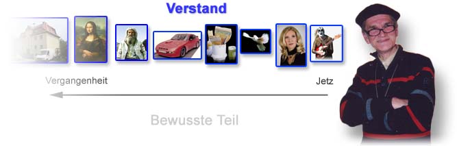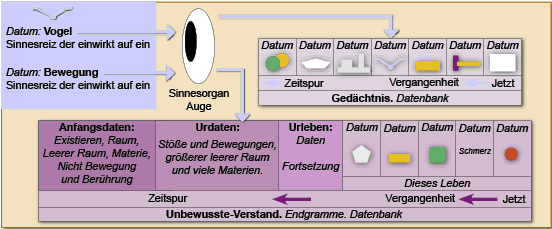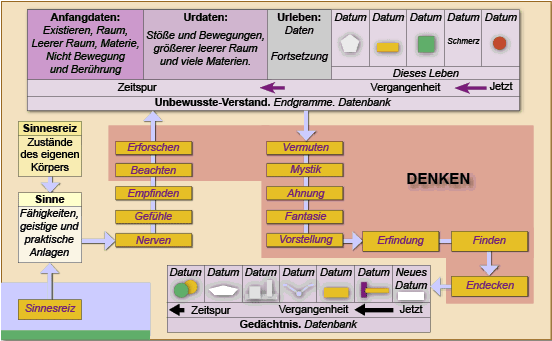 Der Verstand besteht aus Urdaten, dem Existieren, dem Dasein, aus Raum, Masse, anderen, Distanz usw. Danach folgen die gesammelten Aufzeichnungen von Gedanken, Schlussfolgerungen, Entscheidungen, Beobachtungen und Wahrnehmungen eines ICH während seines ganzen Lebens.