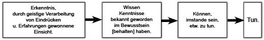 Hier ist eine Tabelle, eine Gradiente des Wissens, angefangen von „Nicht wissen“ bis hin zu „Ich weiß“. Beginnen wir von unten, mit „Ich weiß nicht“, denn bevor jemand irgendetwas weiß, ist dies sein Zustand.