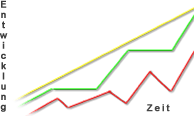 2. Liegt in der Zukunft, und hier müssen wir unsere Vorstellungskraft einsetzen. Wenn es am Rand eine kontinuierliche Entwicklung gäbe, ohne Zerstörung (Gelbe Linie), dann ereichte das Leben ein sehr hohes Stadium in dieser Zeit, wenn es in der Mitte zuerst beginnt. Dann wäre die Kommunikation zwischen Rand und Mitte katastrophal. Die Lösung wäre, dem Rand eine Verlangsamung „einzubauen".