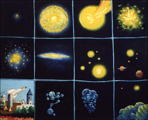 9. The development of a cooled down part of the group (earth) from the beginning (algae as one of the first living organisms) right up to space travel (today).
