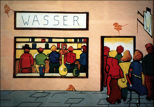 Based on the statements on environmental pollution, the idea for this picture came up while traveling the USA. It was nothing new, since you can buy simple water in supermarkets all over America. However, the essential difference between reality in the USA and the picture is that people queue up and rush for the water, meaning that water has become scarce and valuable. Later I also developed the Oxygen Machine, which came up for the same reasons - another environmental problem.